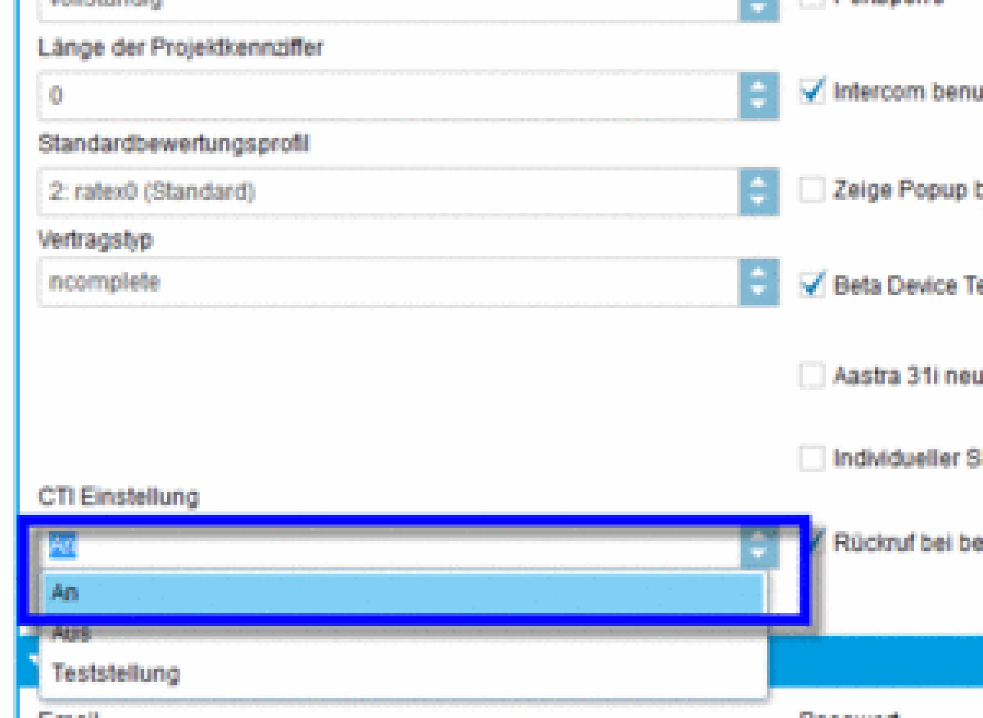 -Log into the administration portal with K-number and nvoice password (e. g. K1234 and test123) as soon as the CTI mode has been activated.