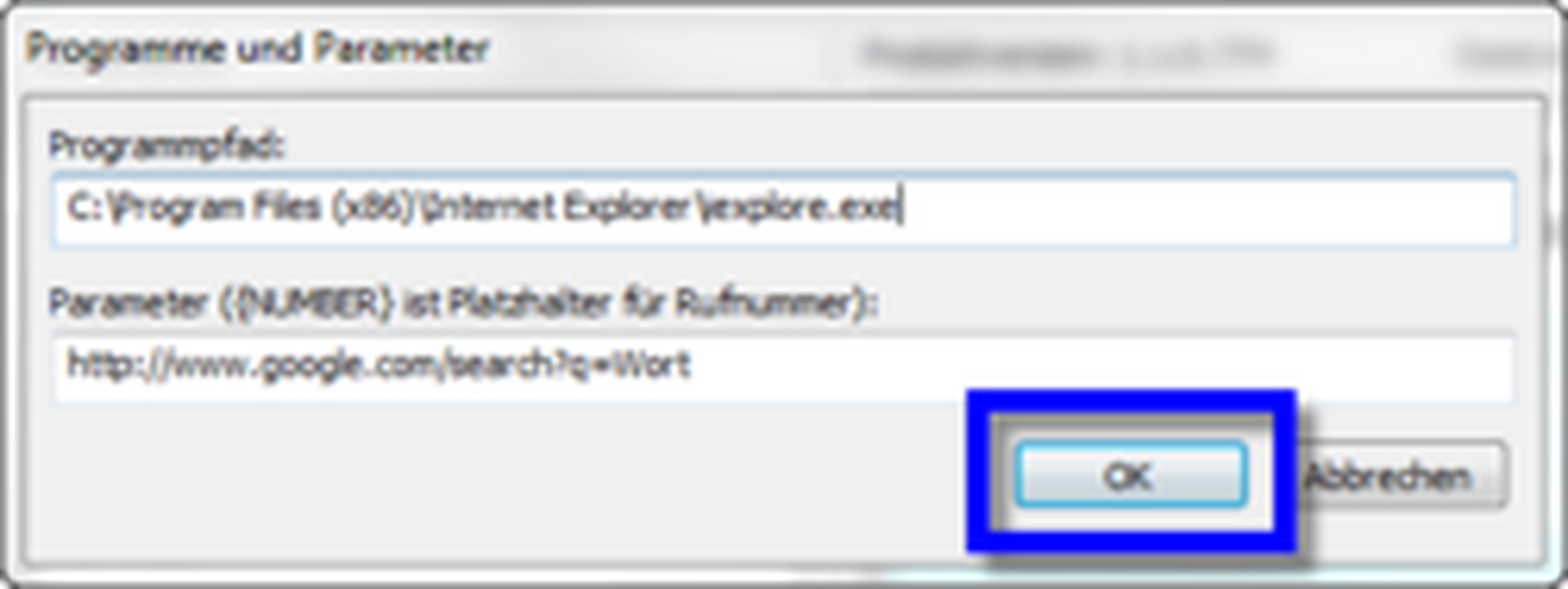 - Enter the URL of the website (incl. HTTP://) under Parameter. Alternatively enter the parameter that will be handed over to the executive file e.g. {NUMBER}